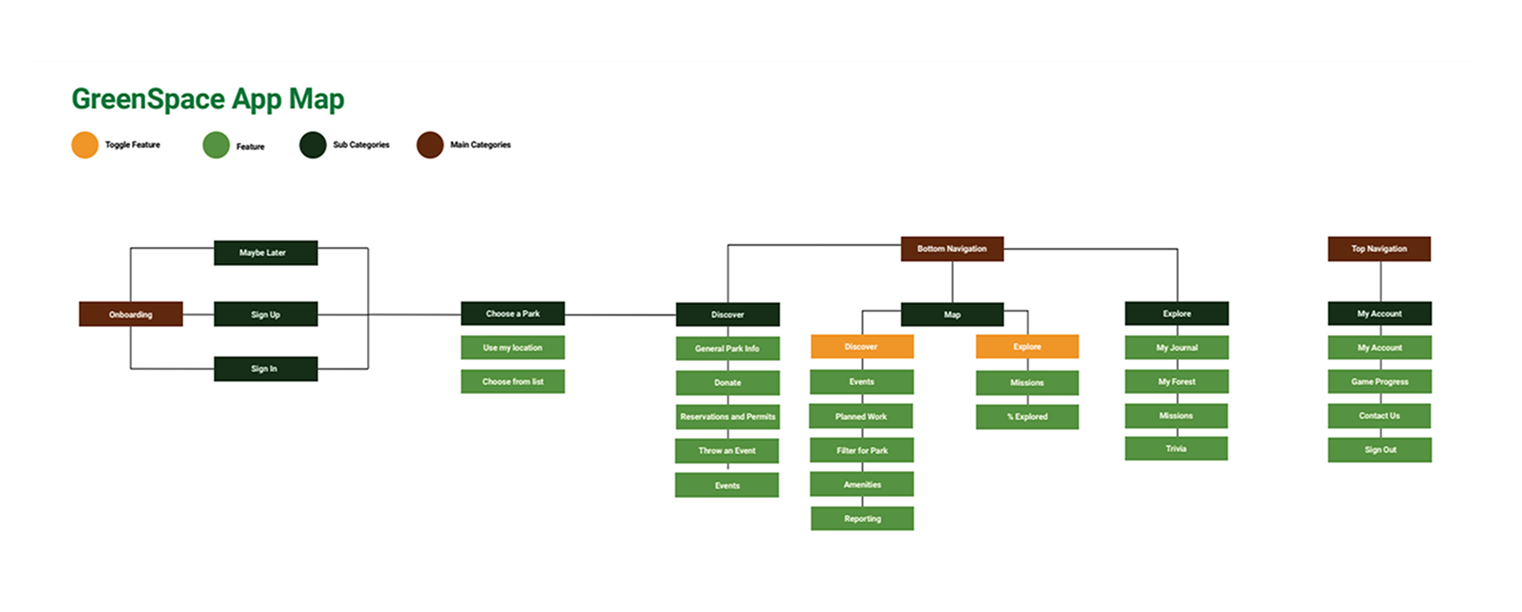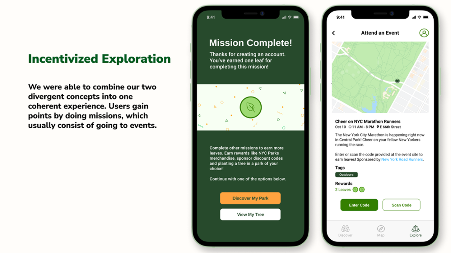 The second concept addressed incentives to branch out and explore with a gamified experience. Users would primarily earn points through park trivia quizzes and missions, which would involve going to events. Active users would win prizes, culminating in a tree being planted within a park of the user's choice.